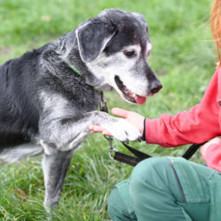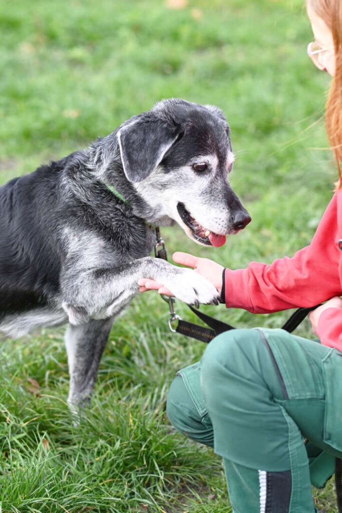 Zug- und Zerrspiele sind wegen Arthrose und Spondylose tabu, besser sind Such- oder Denkspiele. Kinder sind für mich okay, wenn sie verstehen, dass ein älterer Hund auch Rückzug und Pausen braucht. Mit einer netten Hündin könnte ich mir das Zusammenleben gut vorstellen. Ob ich auch mal allein bleiben kann, müssen wir testen und bei Bedarf geduldig üben.