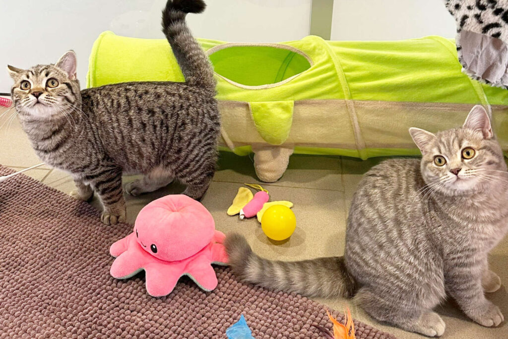 Ich, Lumen, bin anfangs schüchtern, taue aber mit Vertrauen gut auf. Dann lasse ich mich anfassen, bin lieb, schmusig und natürlich kittentypisch verspielt. Mein Bruder Loco ist auch anfangs zurückhaltend, braucht etwas mehr Ruhe und Zeit, um anzukommen, und beobachtet lieber erst einmal still aus sicherer Entfernung. Wenn er sich sicher fühlt, lässt auch er Nähe zu und spielt gern.