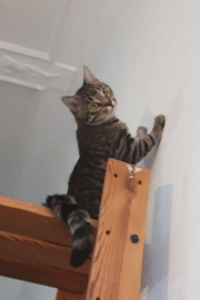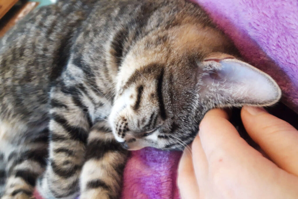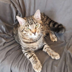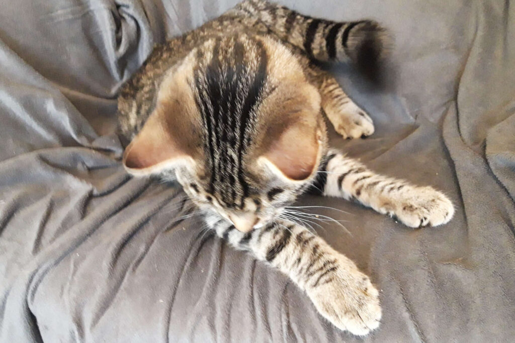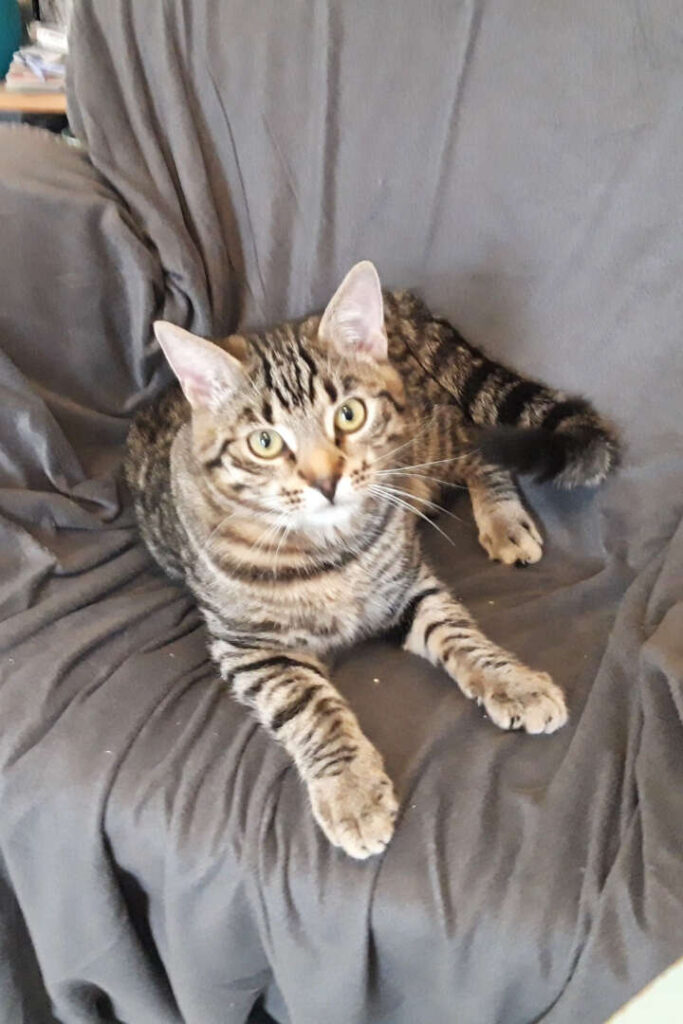 Ich, Dino, bin der hübsch Getigerte und oft ein kleiner Angsthase. Auf der Straße geboren, kam ich als Kitten vor Panik schlotternd auf meiner Pflegestelle an, wo ihr mir sehr viel Zeit dafür nahm, im Zweifelsfall (und das war fast jeder) Menschen weiträumig zu meiden. Und immer dann, wenn mich der Mut verlassen wollte, machte ich einen weiteren zögerlichen Babystep auf den Menschen zu: Das erste Mal mit einem Menschen spielen, das erste Mal etwas Nähe zulassen, das erste Mal zum Menschen aufs Sofa springen, das erste Mal miauen (statt ängstlich zu fauchen).