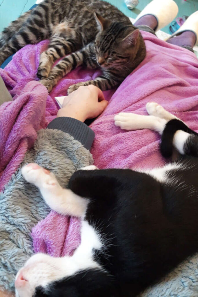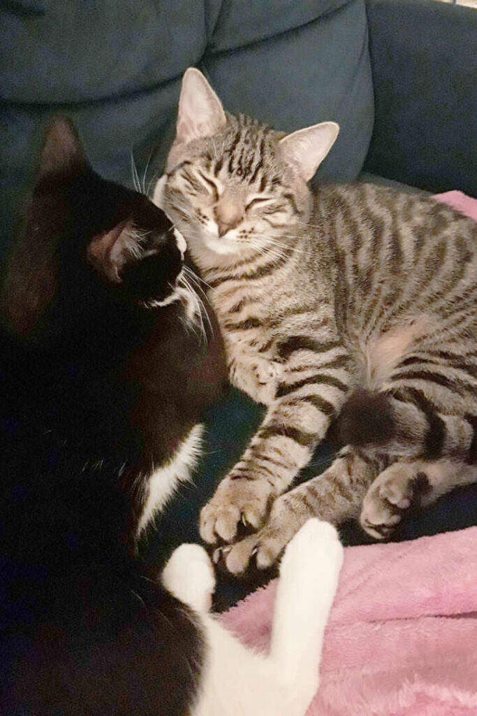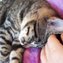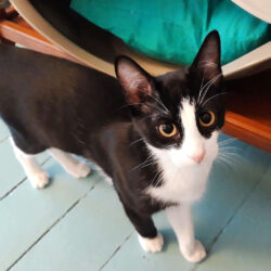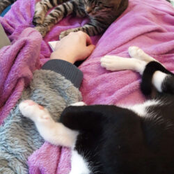 Inzwischen bin ich zwar immer noch ein schreckhafter Angsthase, der öfter noch lieber flüchtet, habe aber nun deutlich mehr Vertrauen und endlich das Kuscheln für mich entdeckt: Ich geht meinem Menschen um die Beine, werde gern am Kopf und besonders am Nackenfell gekrault, schlafe auch mal zart an den Menschen geschmiegt und würde mich bestimmt auch noch mehr trauen, wenn der eifersüchtige Milo nicht manchmal dazwischen funken würde.