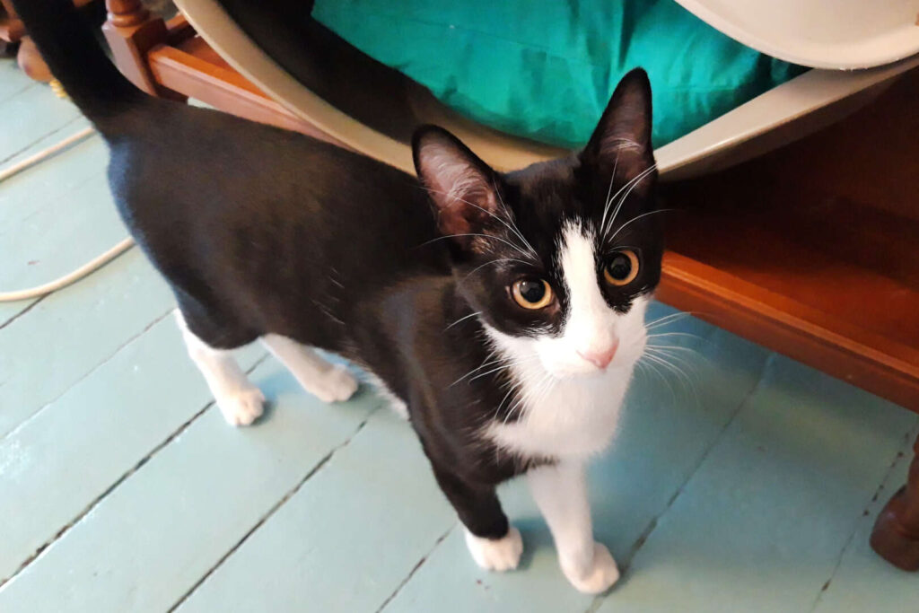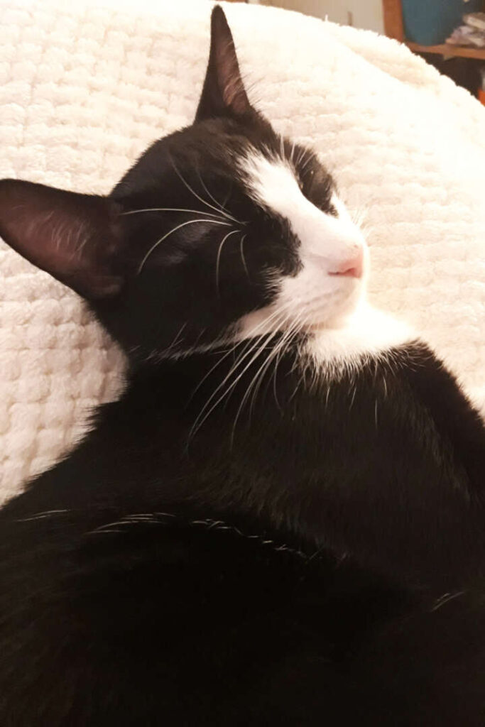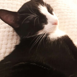 Mein schwarzweißer Kumpel Milo ist sehr gutmütig, kuschlig und macht grundsätzlich wenig Quatsch. Obwohl er selbst eine halbe Portion ist (und vielleicht auch bleibt), macht er keine halben Sachen: Stark menschenbezogen, könnte er nicht nur den lieben langen Tag schnurrend auf dem Schoß oder, unaufdringlich an die Beine gekuschelt, mit im Bett verbringen, nein: Auch sonst will er immer mit dabei sein. Auf dem Schreibtisch hat sich dazu ein Katzenkörbchen bewährt, bei allem anderen legt er sich am liebsten um die Schultern, um alles im Blick zu haben, wo er sich recht vorsichtig und mit sehr gutem Balancevermögen ankuschelt.
