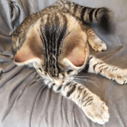 Auch beim Spielen und Toben gibt er alles und tobt wie ein wildgewordener Handfeger über Stock und Stein. Im Jagdmodus kennt er keine Gnade, hier passt man besser gut auf seine Hände auf. Geschickt und hartnäckig erklimmt er früher oder später jede Höhe (sitzt etwa gern auf Türen), steigt in jeden Schrank und ist auch sonst wild entschlossen, keine Chance auf ein Abenteuer auszulassen. Das derzeitige Zusammenleben mit einem wenig selbstbewussten Kater dominiert er klar. Milo teilt nicht gern, weder Aufmerksamkeit noch Spielzeuge, ist auch beim Toben nicht zimperlich.